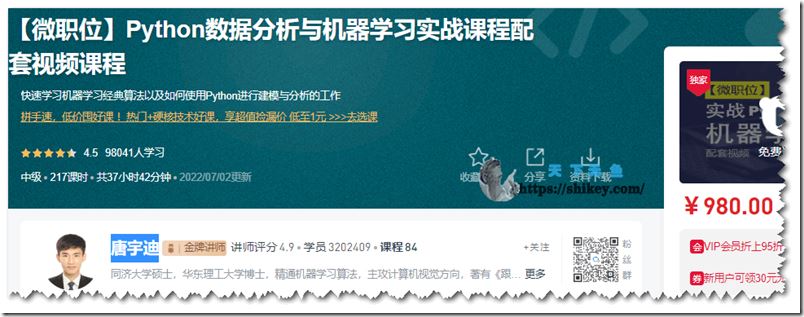 0 计算机编程 2023年12月18日 由 W82P · Published 2023年12月18日 51CTO微职位 唐宇迪 Python数据分析与机器学习实战课程配套视频课程 百度网盘下载 系列课程总共近40章节,并保持持续更新。包含经典机器学习算法原理推导...